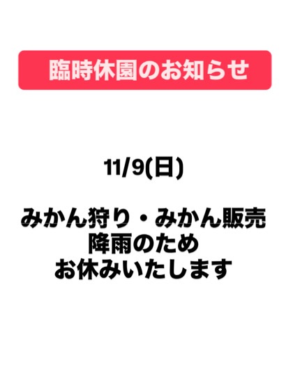 本日11/9(日)の営業についてですが、昨晩遅くからの降雨と今後の天気予報を考慮して、誠に残念ですが休園とさせていただきます。